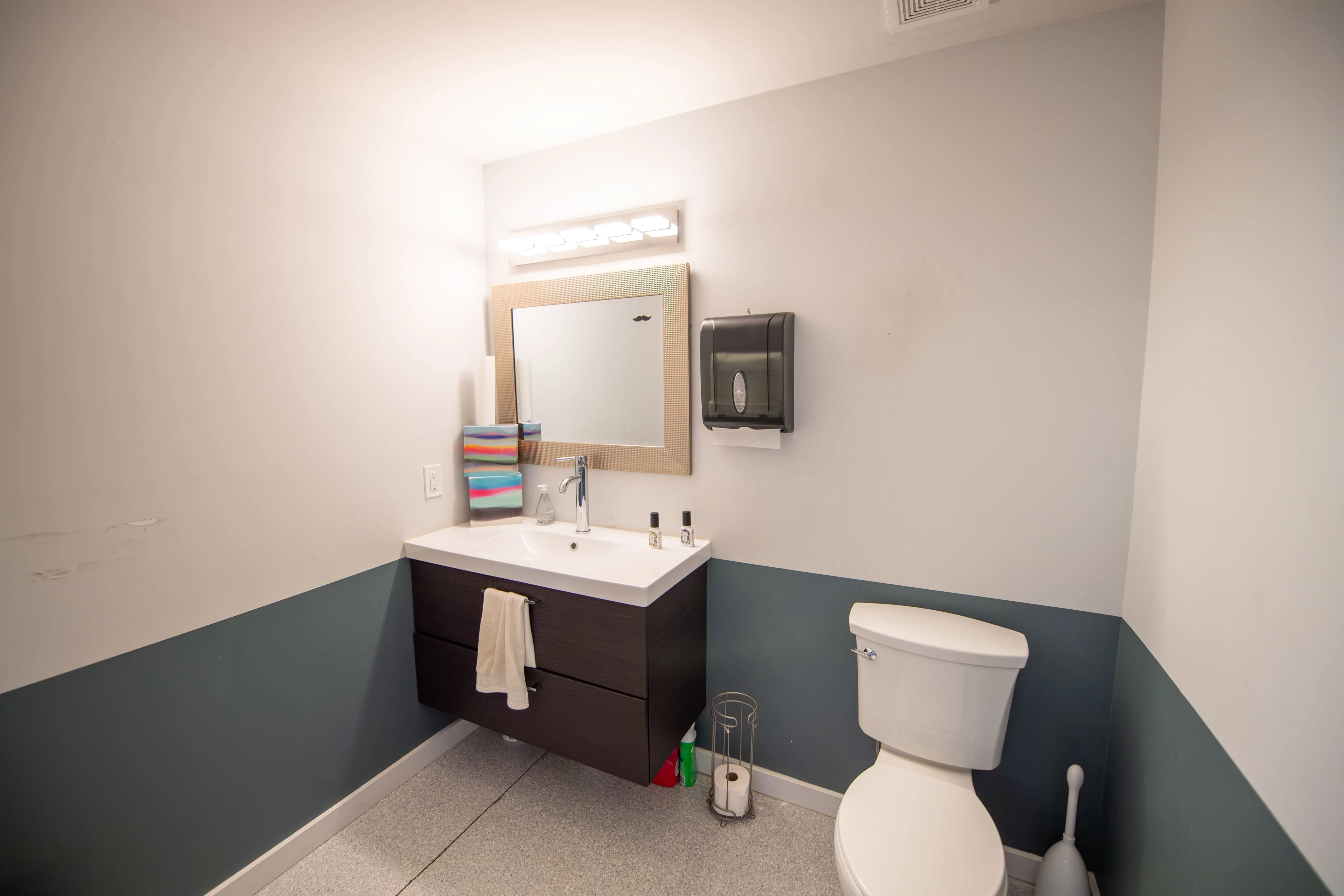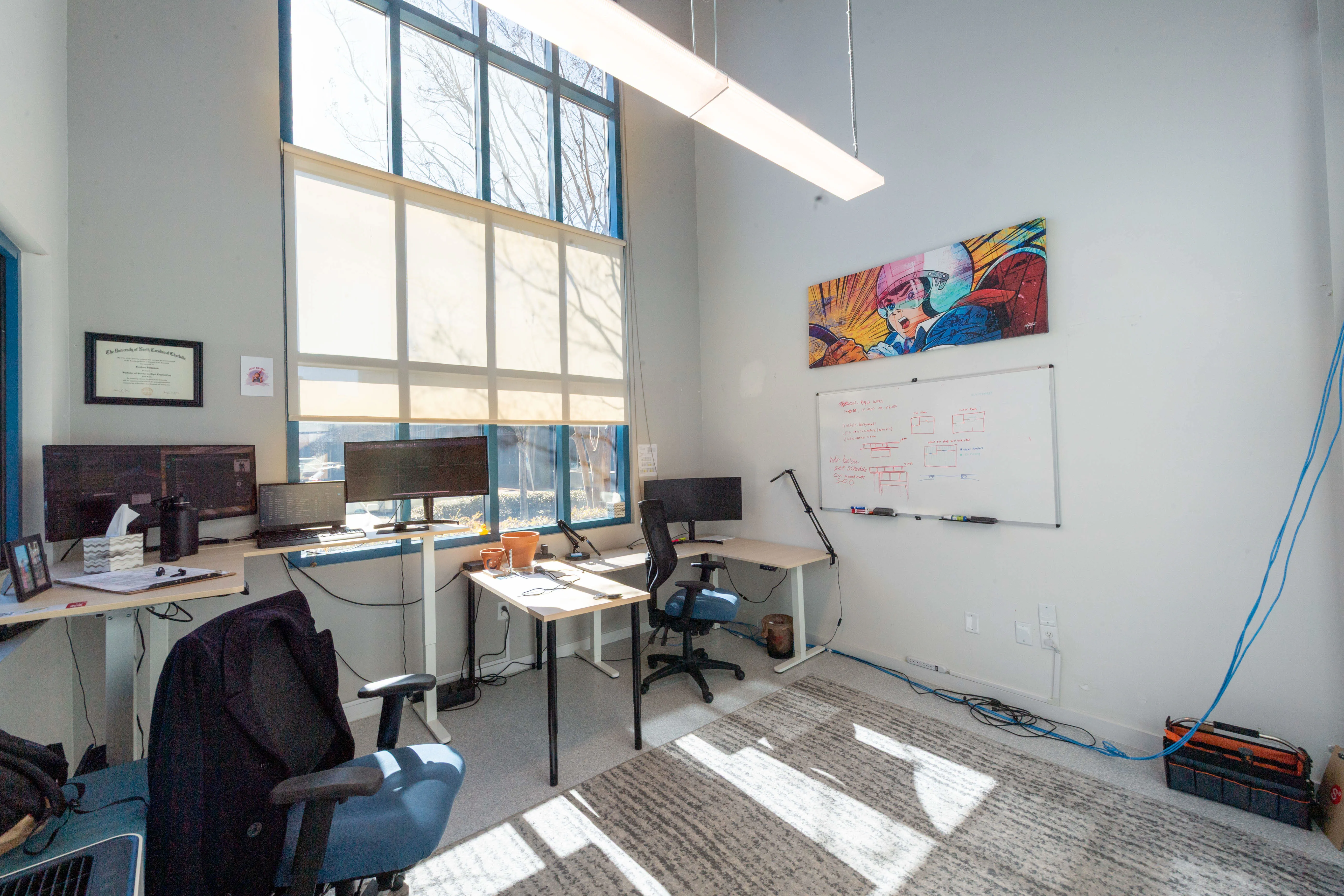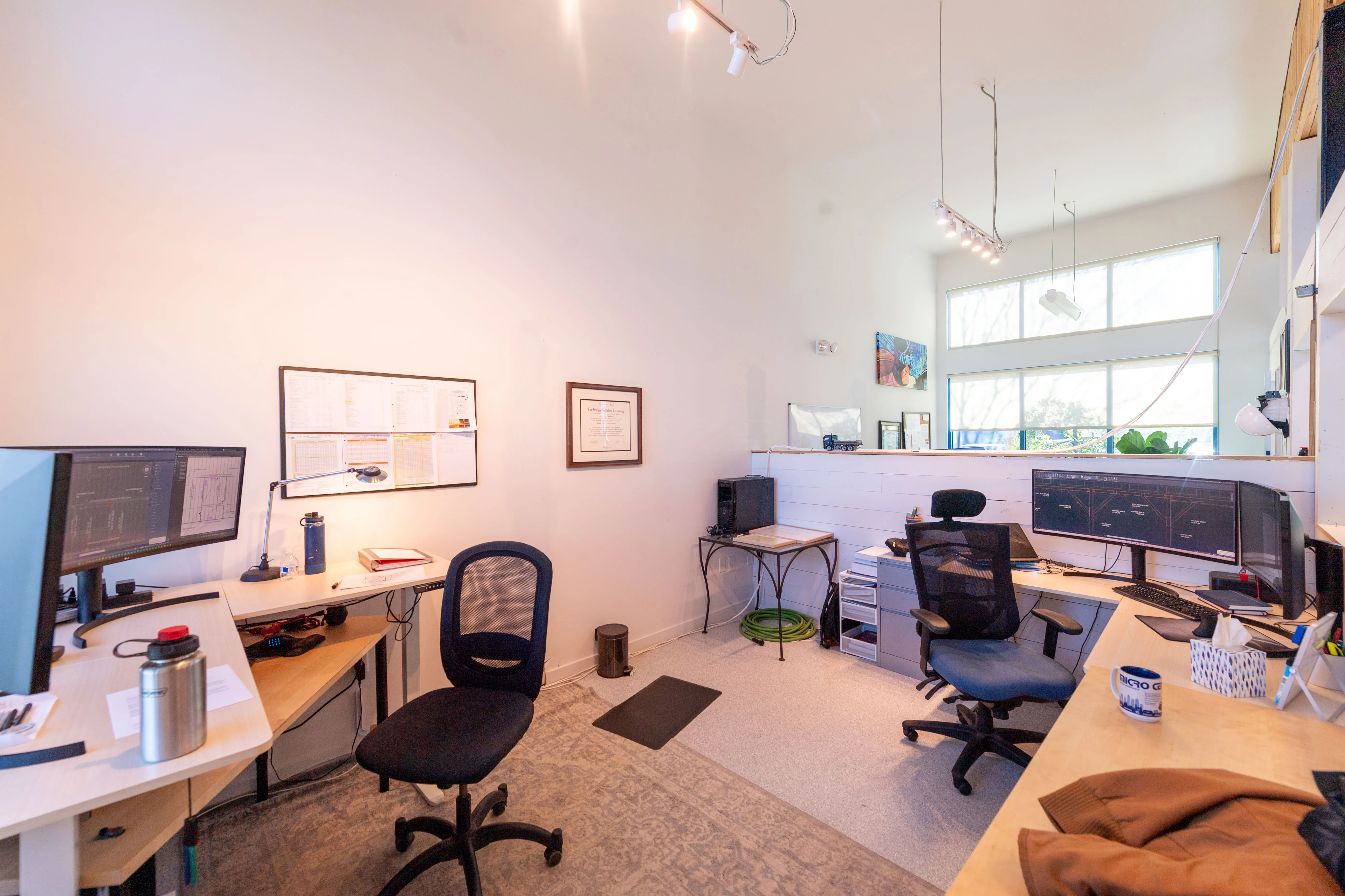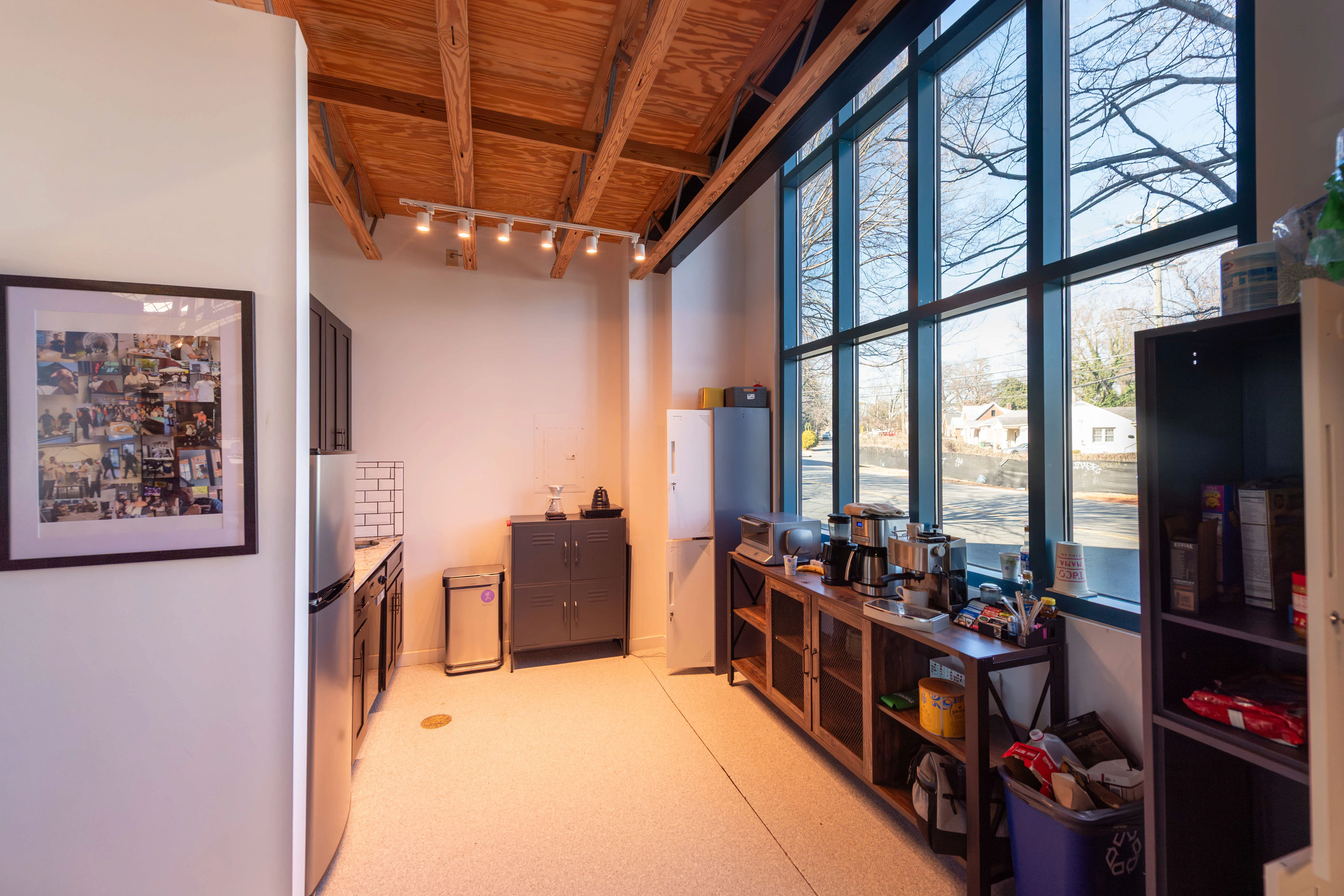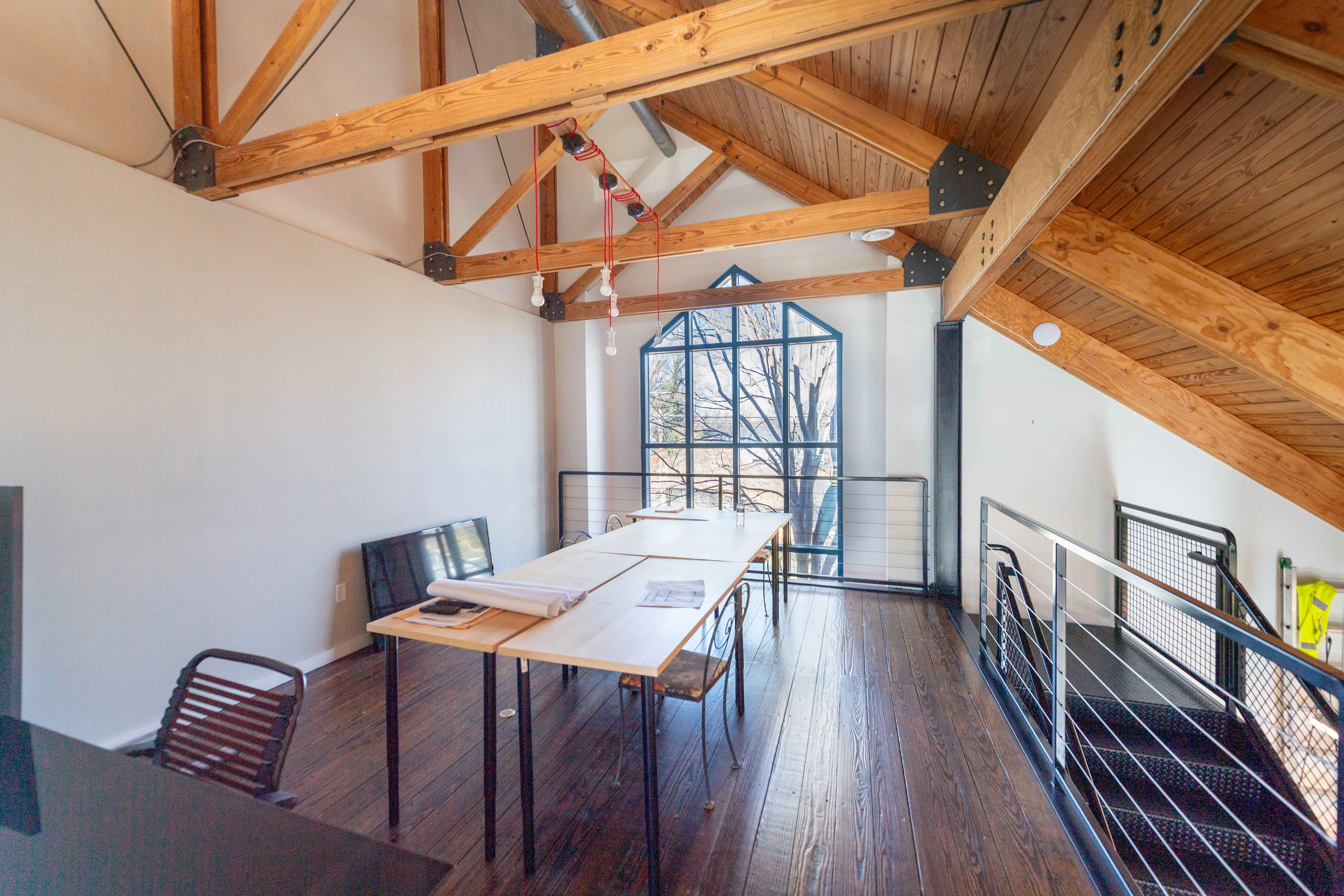 Suite 301 features a modern industrial aesthetic with soaring open-beam ceilings, creating an expansive and airy work environment. The thoughtfully designed layout includes multiple private work areas alongside open collaborative spaces, ideal for creative, technology, and professional users. Recent partitioned upfit enhances both functionality and privacy, but can be removed as desired. Spacious parking with beautiful landscaping.