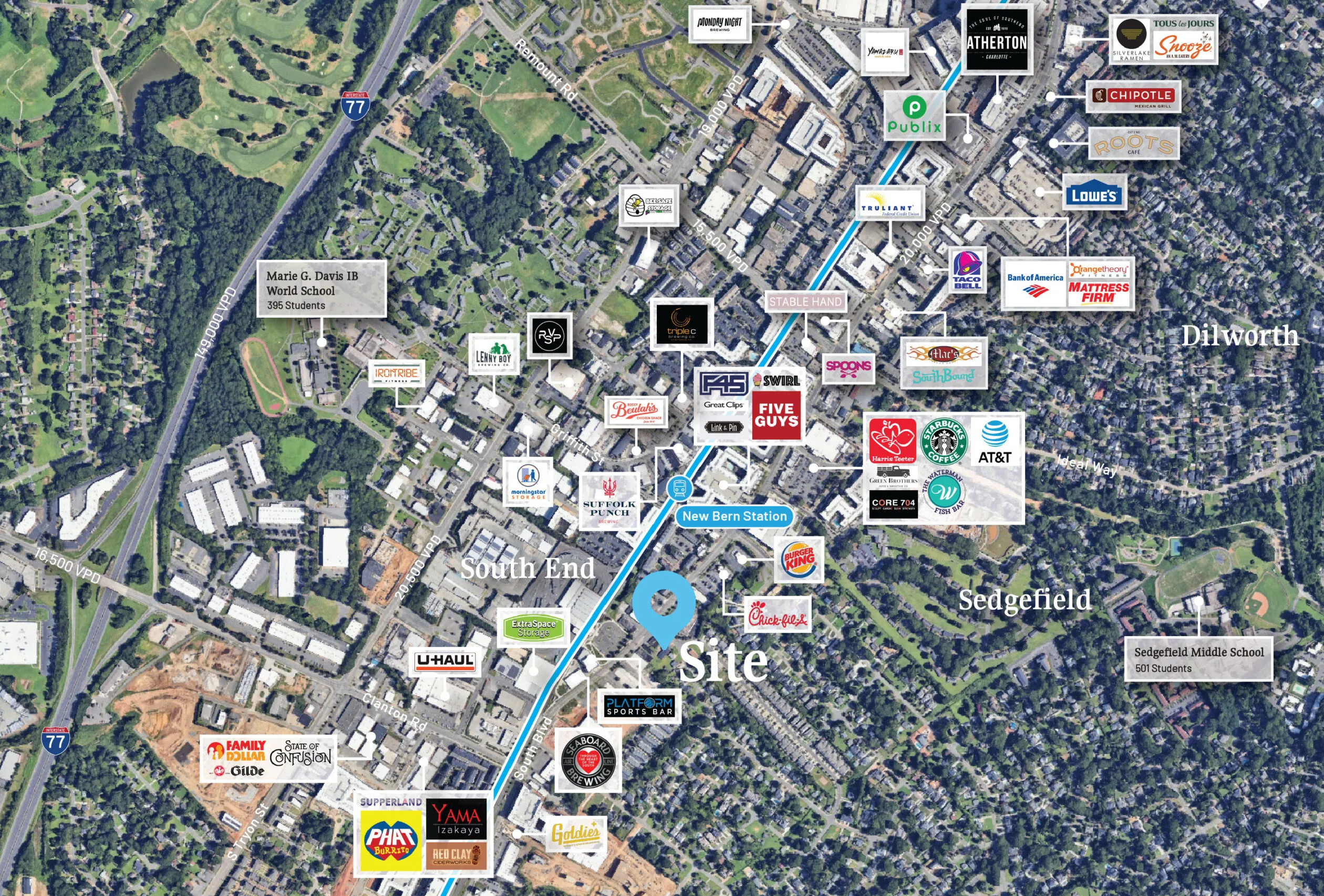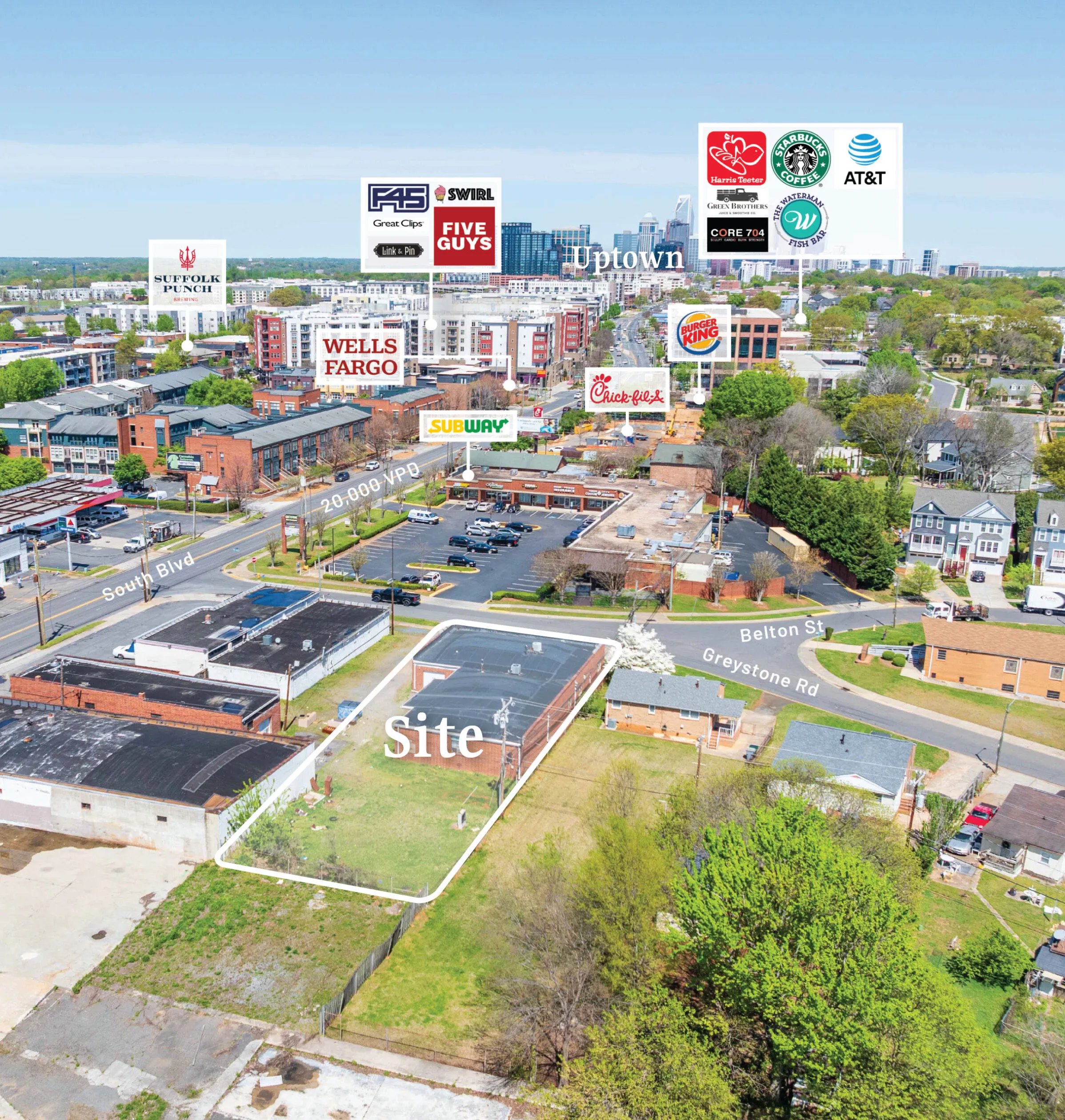 Opportunity to lease +/- 4,560 SF at 212 Greystone Road, located directly across from The Platform in the heart of South End — Charlotte’s most vibrant and fast-growing urban district. Situated just off South Blvd and within walking distance of the LYNX Blue Line and Rail Trail, this highly visible location offers immediate access to a dense mix of retail, dining, and residential developments. Ideal for retail, office, or medical office users seeking exposure in one of the city’s premier live-work-play environments.