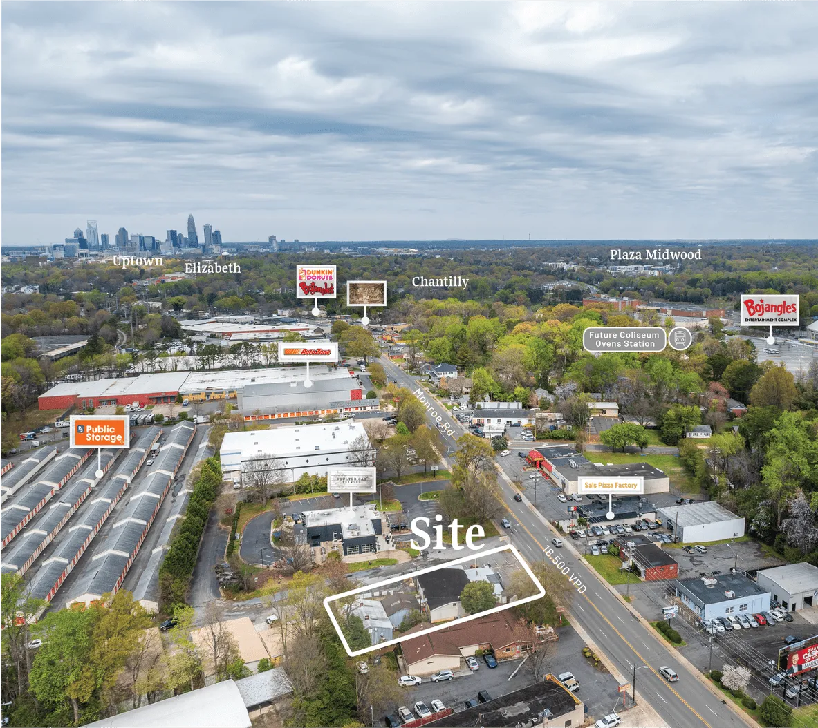 The Nichols Company is proud to offer 3734 Monroe Rd. Strategically located in Charlotte’s thriving business district, this property offers excellent visibility and accessibility along with easy access to major highways and transportation routes. Positioned in a dynamic neighborhood, ML-2 zoning offers flexibility and potential for a wide range of businesses and industries.