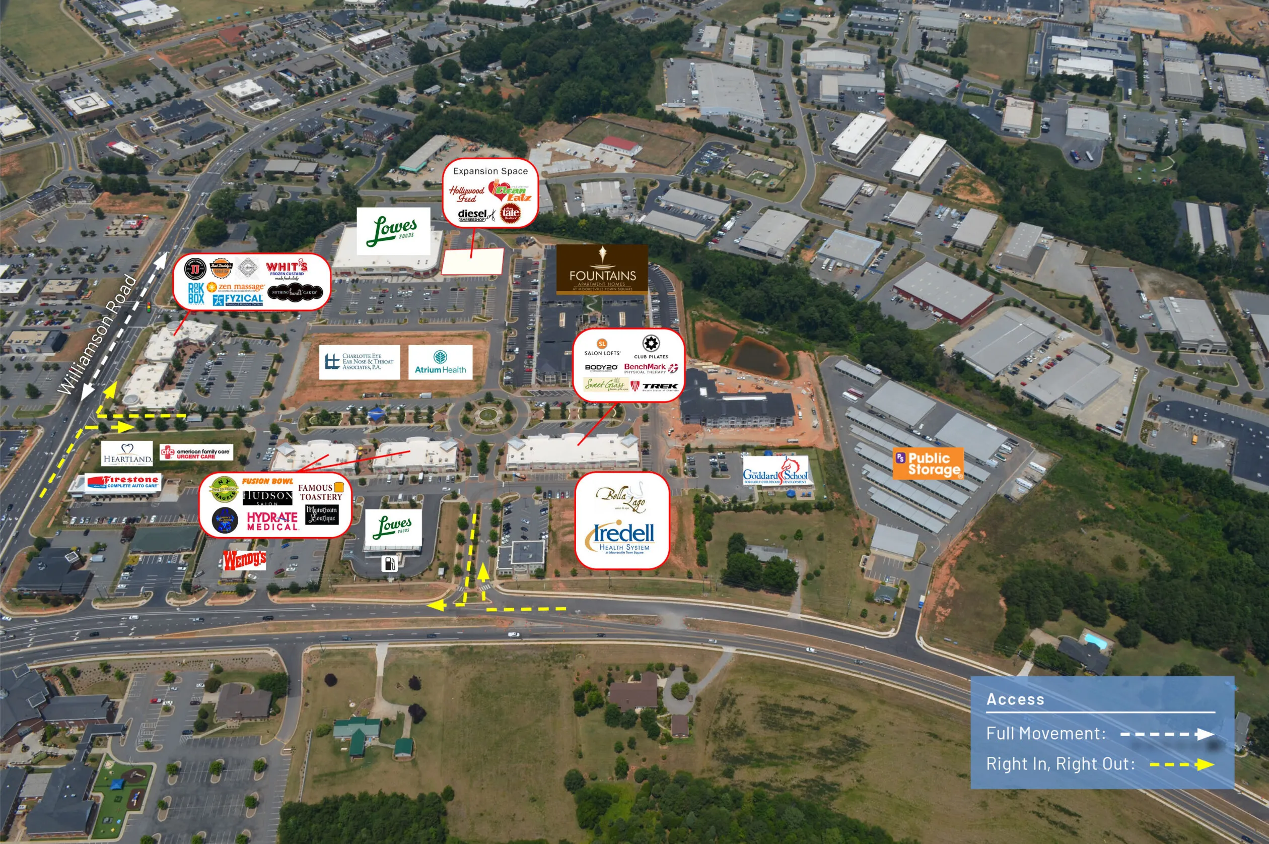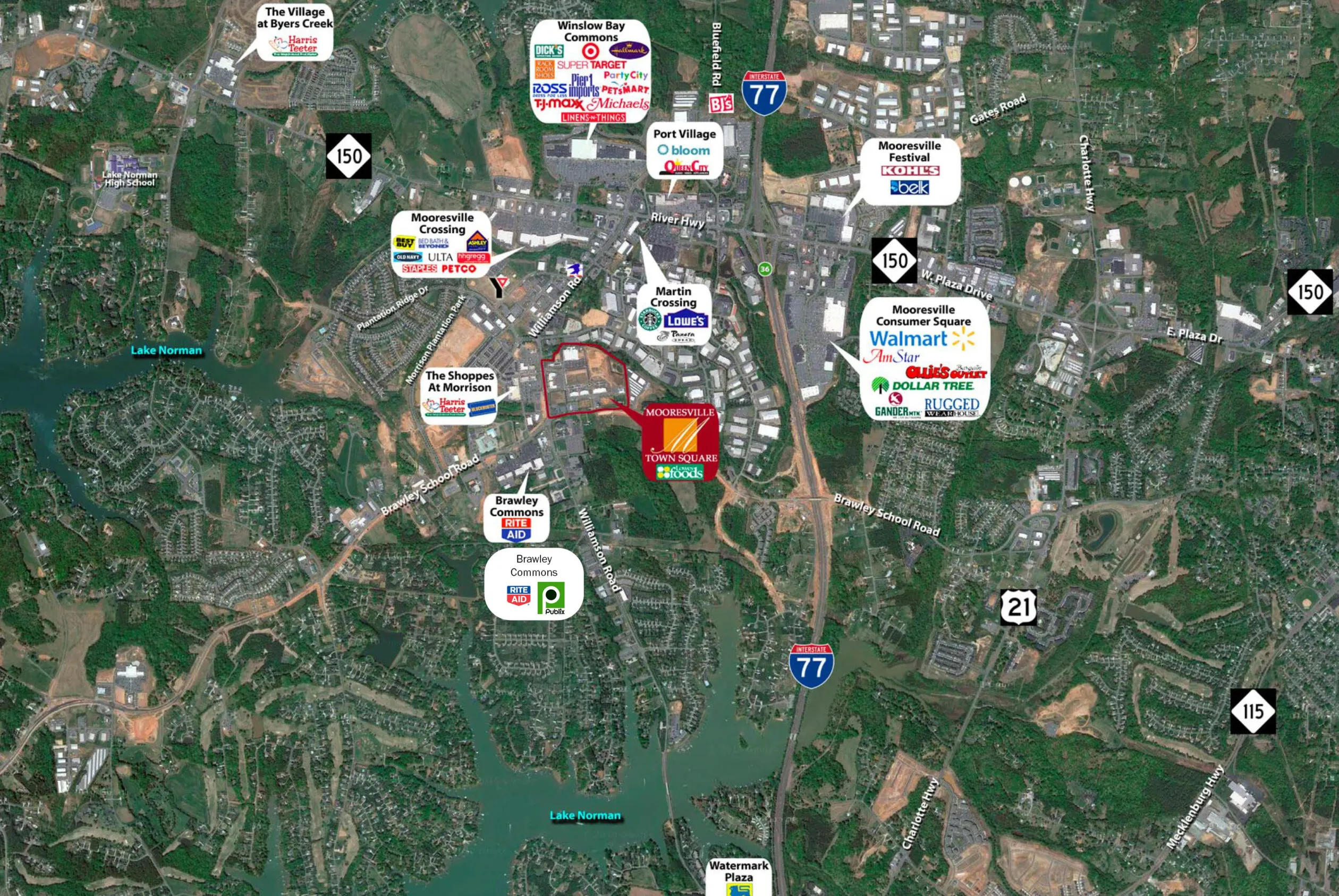 Mooresville Town Square is located along Brawley School Road and Williamson Road in Mooresville, NC. This intersection is one of the most heavily traveled in all of Mooresville with traffic counts at 25,000 cars per day on Williamson Road and 31,000 cars per day on Brawley School Road. Right off of I-77 with direct access from exit 35, this location has premium signage visibility and has easy access to high-income Lake Norman communities which have numerous household incomes surmounting $100,000.