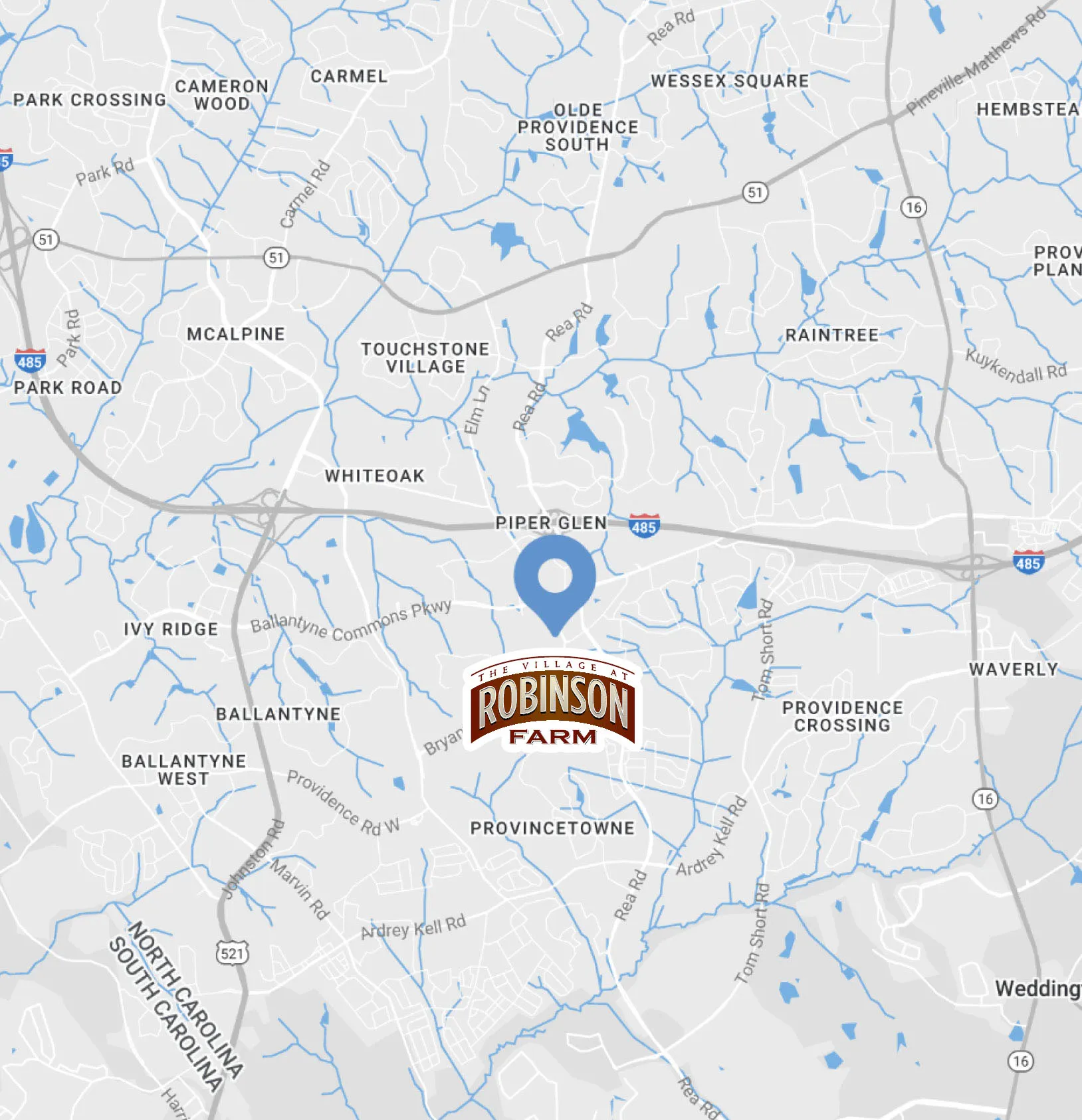 Located southeast of Charlotte in the Ballantyne market, The Village at Robinson Farm is situated on Rea Road, with additional access from Williams Pond Lane. Designed to offer a blend of retail, dining, and office spaces, the center features a well-curated tenant mix that enhances the surrounding community. The Village at Robinson Farm benefits from high visibility, heavy foot traffic, and close proximity to I-485 and other retailers.