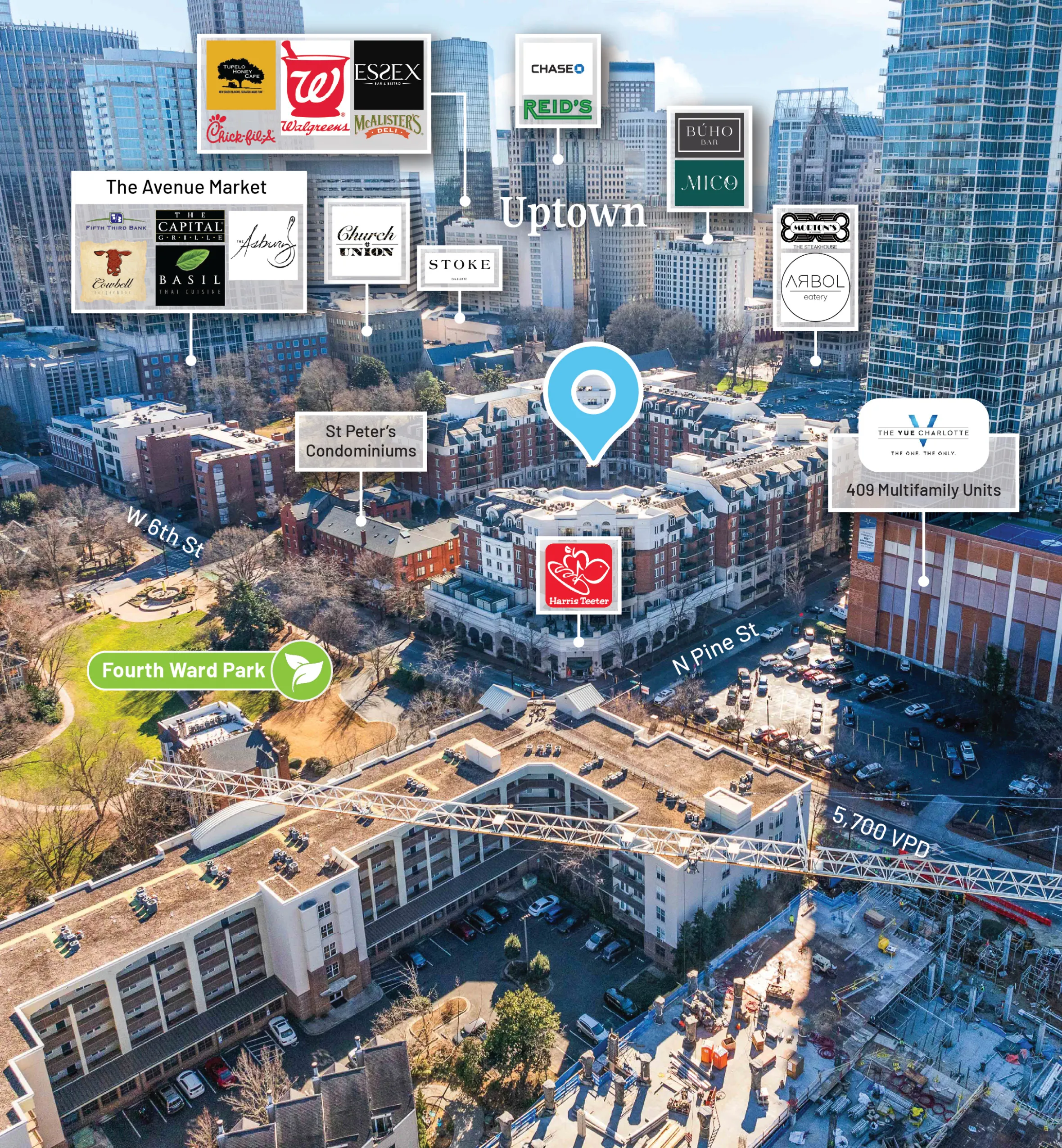Prime retail space available in the heart of Charlotte’s dynamic and thriving Uptown district. This ground-floor retail space offers an exceptional location in uptown’s luxe Fifth and Poplar (approx. 300 residential units), anchored by the popular Harris Teeter grocery store, combining convenience and visibility. This space features an open, flexible floor plan with large windows, includes a utility/IT room, private office and large restroom. Ideal for a coffee shop, fitness and wellness studios, beauty and spa services, personal care businesses, or a second- generation hair salon (former hair salon with existing plumbing capabilities). The space is delivered in warm vanilla shell condition, ready for customization to fit your business needs. This retail suite offers unbeatable walkability, access to a thriving neighborhood enveloped in modern living, surrounded by new construction development.