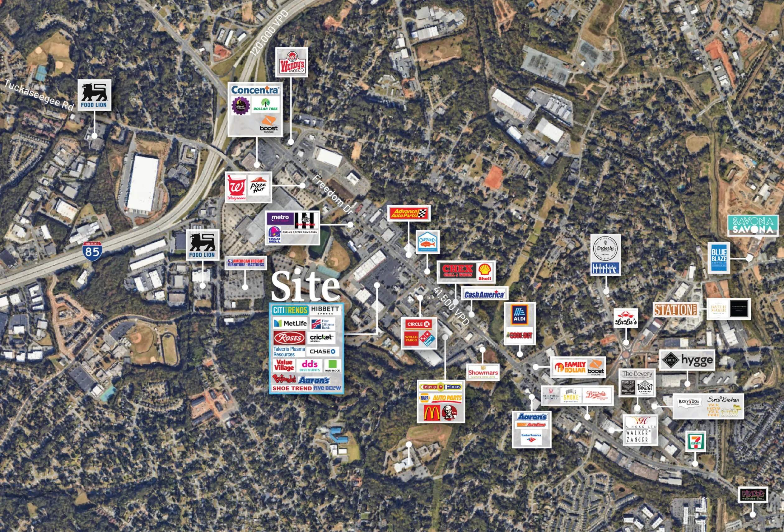 Located in Charlotte with easy access to and from I-85 (1/2 mile), I-77, Morehead Street, and Wilkinson Boulevard. 2,000 new homes are planned or under construction within 3 miles. Significant amount of parking. Consistently high traffic counts with over 41,500 VPD along Freedom Drive.