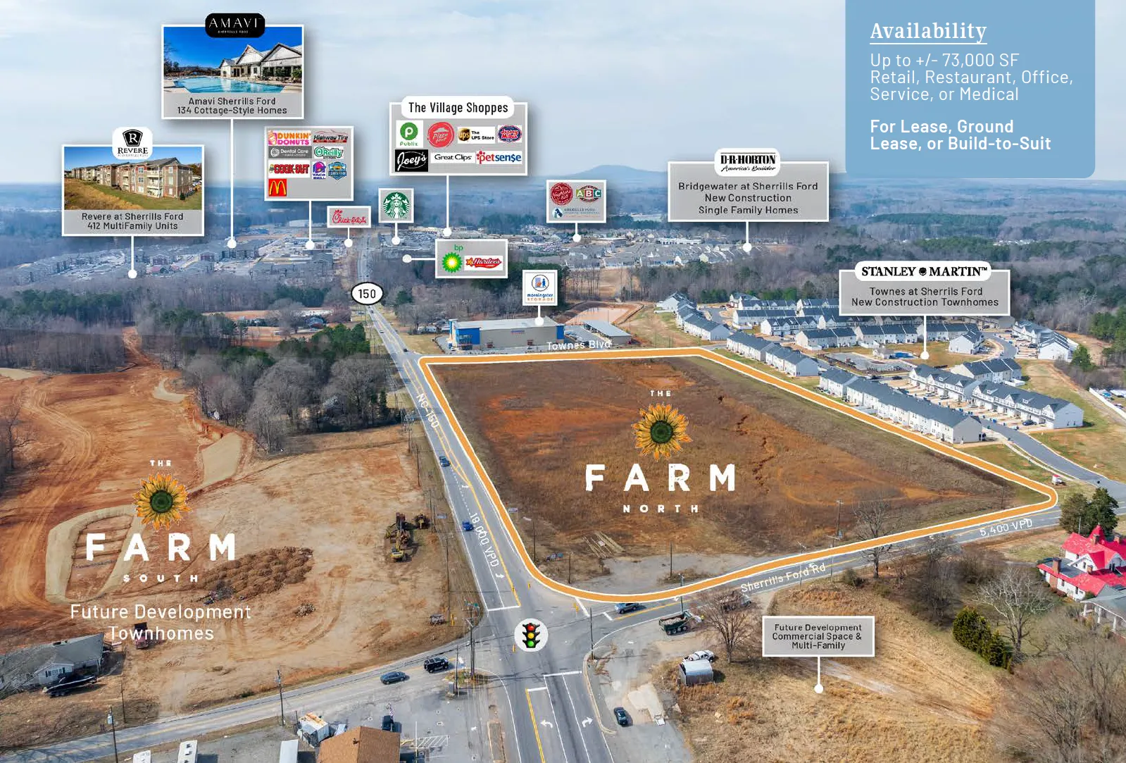 Up to +/- 73,000 SF available at Farm North at the intersection of Sherrills Ford Road and NC-150 in Terrell, NC. The sites are approved for a variety of uses including retail, restaurant, service, medical, and office space. The submarket boasts excellent traffic generators, including a Publix-anchored shopping center less than a mile from the site. The immediate area is surrounded by residential communities planned and under construction.