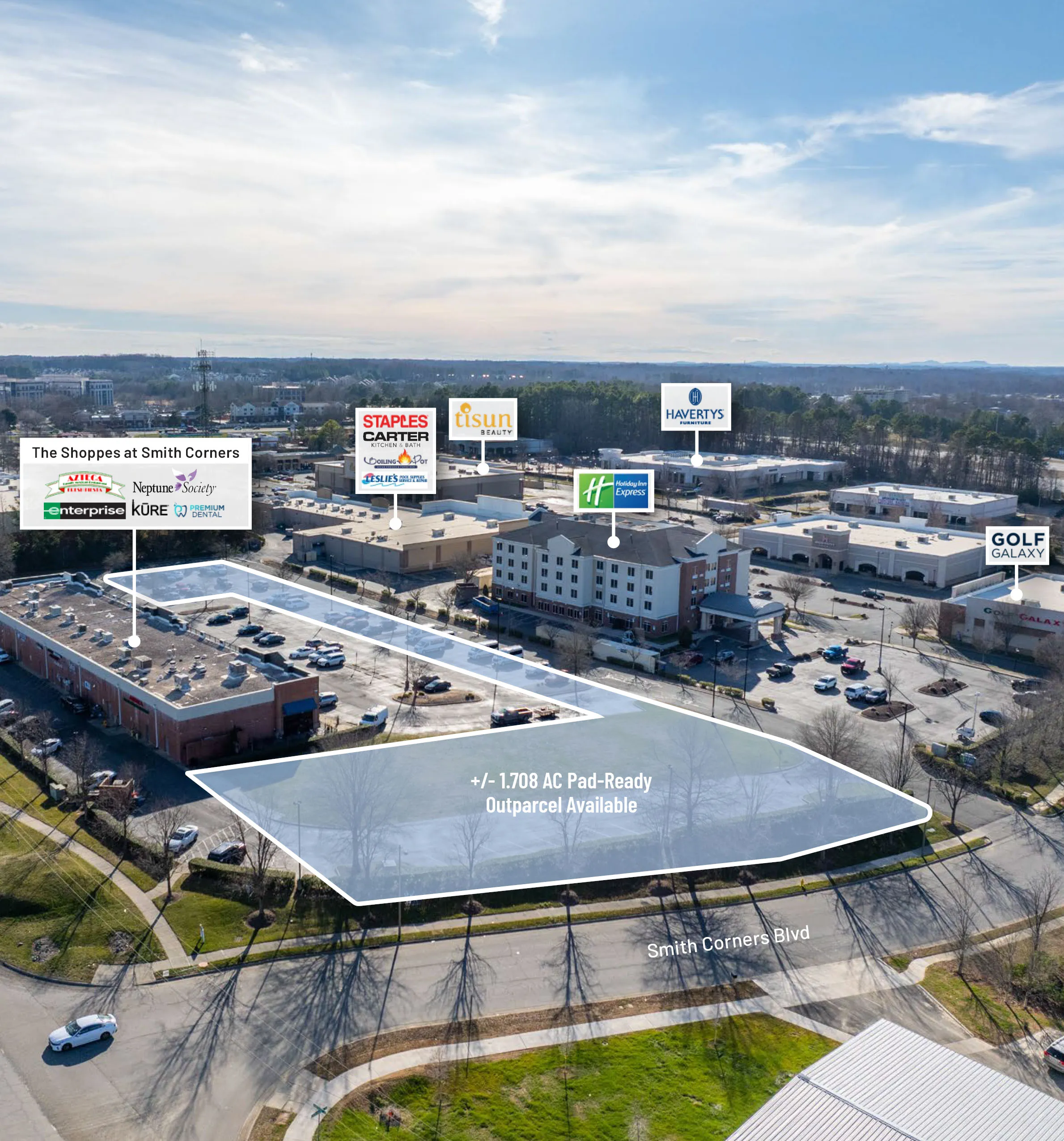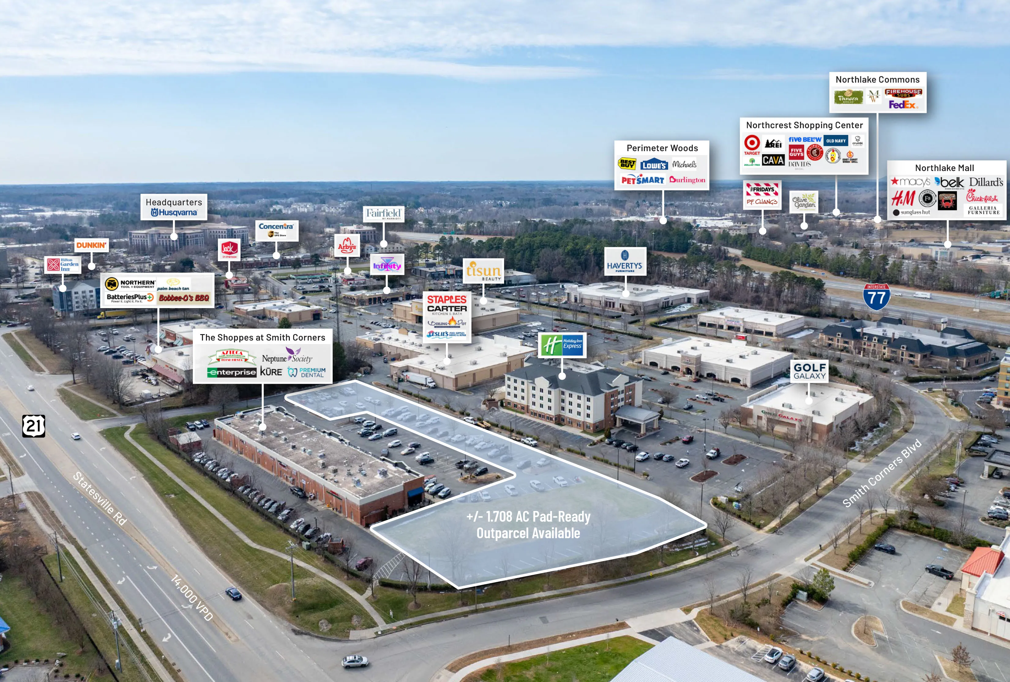 Outparcel available at The Shoppes at Smith Corners, a thriving 18,672 SF retail center located in Charlotte's high-growth northern corridor near Northlake Mall. Strategically positioned near I-485 and I-77 with excellent visibility from Statesville Road, the property benefits from strong traffic counts and proximity to Harris Corners Corporate Park, a 500,000 SF Class A office complex. The center features a stable, service oriented tenant mix anchored by Azteca Mexican Restaurant.