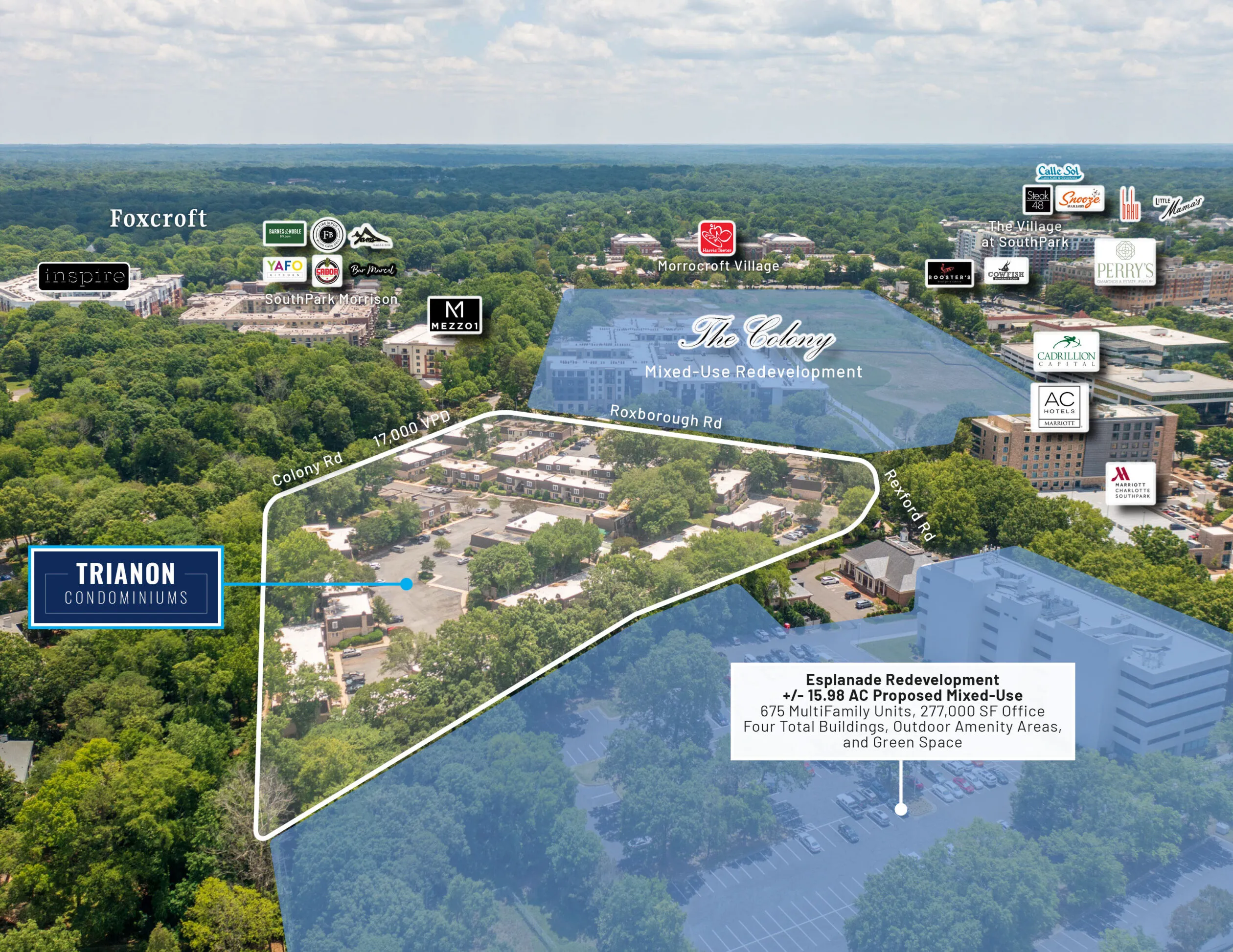 The site is a rare opportunity to enter into one of Charlotte’s most exclusive submarkets, the thriving area of SouthPark. SouthPark displays rapidly growing trends in retail, office, mixed-use, hospitality and multifamily with developments booming around the site and surrounding area. Charlotte’s luxury shopping destination, SouthPark Mall, is within walking distance to the Property. The area is also home to some of Charlotte’s highest rated dining, including Rooster’s Wood- Fired Kitchen, Baku, The Cowfish Sushi Burger Bar, BrickTops, Tuscana, Steak 48, Little Mama’s Italian and many more.